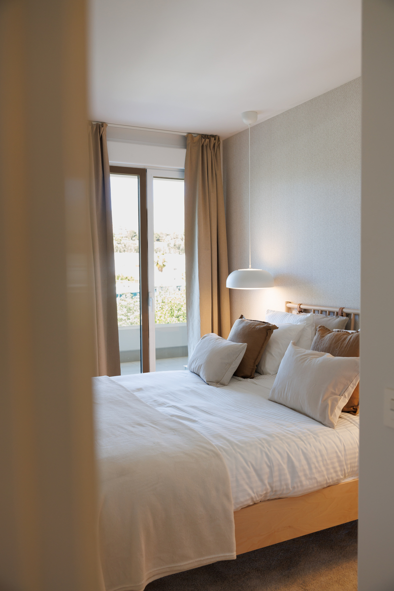 This apartment includes three bedrooms: two with a double bed and the other with two single beds, each furnished with fresh linens and bedding.